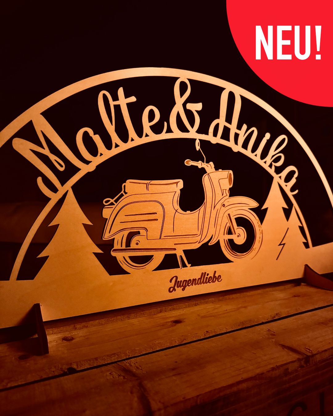 Lange habt ihr gewartet, unzählige Nachrichten haben uns erreicht und wir haben euch erhört! Hier ist er, der Simson Schwalbe Schwibbogen mit Wunschnamen und optionaler Gravur (hier Jugendliebe). Als Teil unserer Ostalgie-Serie lässt er unsere Herzen im Ost-Takt höher schlagen!
